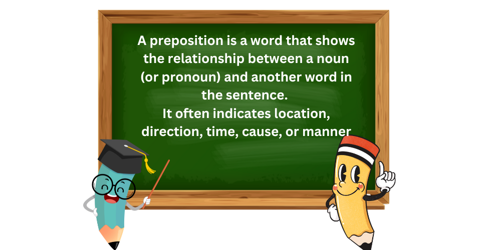 A preposition is a word that shows the relationship between a noun (or pronoun) and another word in the sentence. It often indicates location, direction, time, cause, or manner